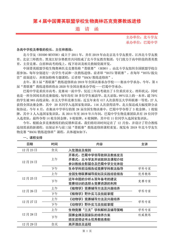 第4届中国菁英联盟学校生物奥林匹克竞赛教练集训邀请函